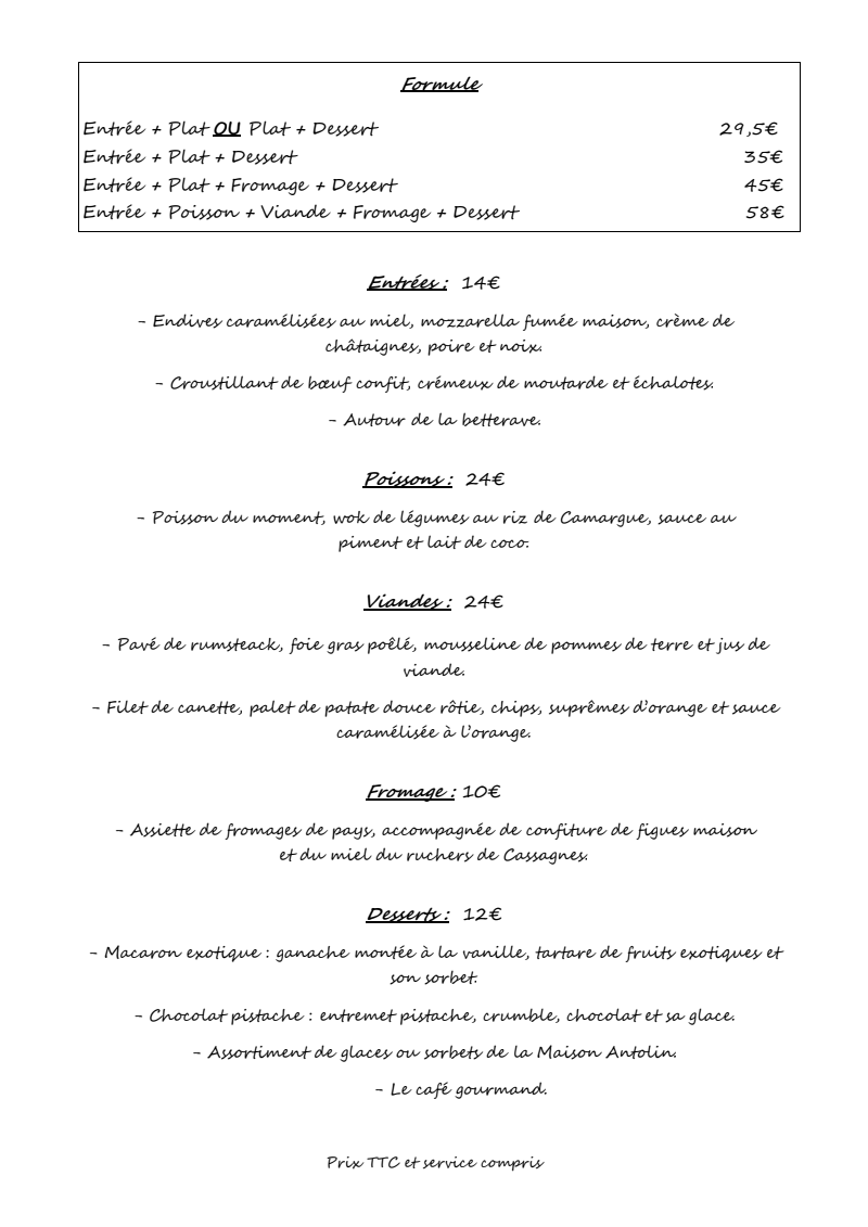 *Tous nos plats peuvent contenir des allergènes. Merci de nous informer de vos allergies par téléphone lors de la réservation ou dans la case "message" du formulaire.